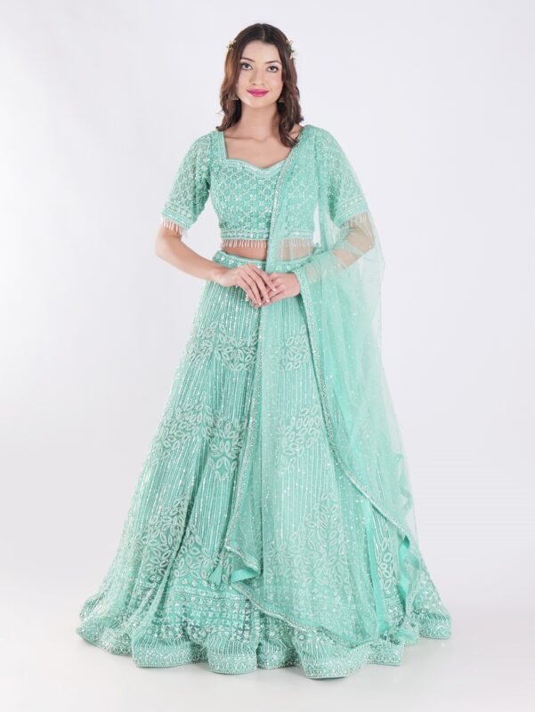 Stunning Mint Green Intricate Embroidery With Silver Sequins And Beads Shimmering Effect Bridal Lehenga Set