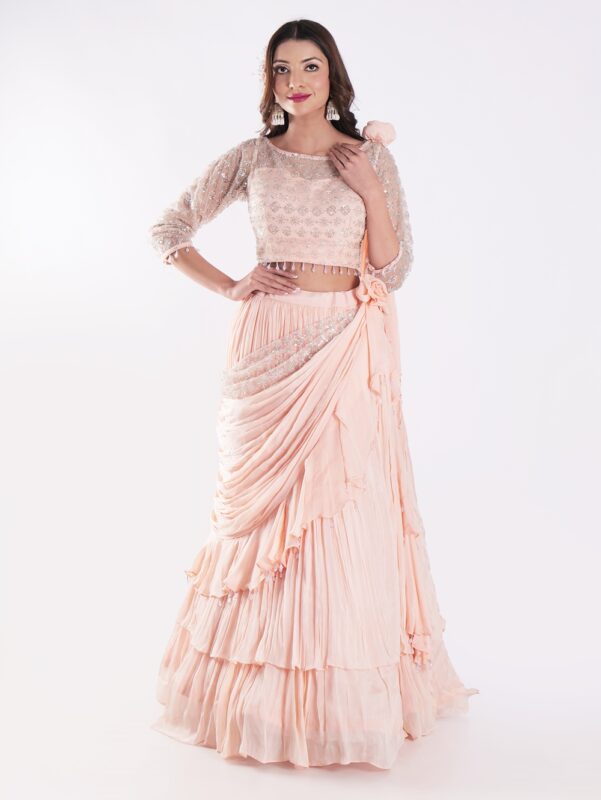 Beautiful Peach Colored Embroidered Crop Top Outfit Ruffle Drape Lehenga Set