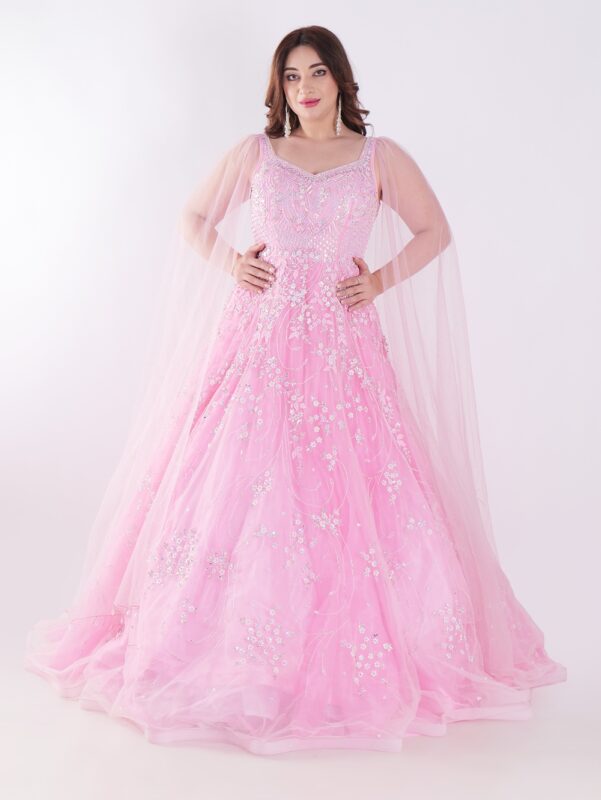 Delicate Floral Pattern And Shimmering Embellishments Pink Color Party Wear Gown