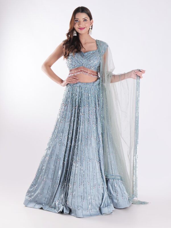 Beautiful Light Blue Flowing With A Delicate Embellished Bodice Indowestern Lehenga Choli Set