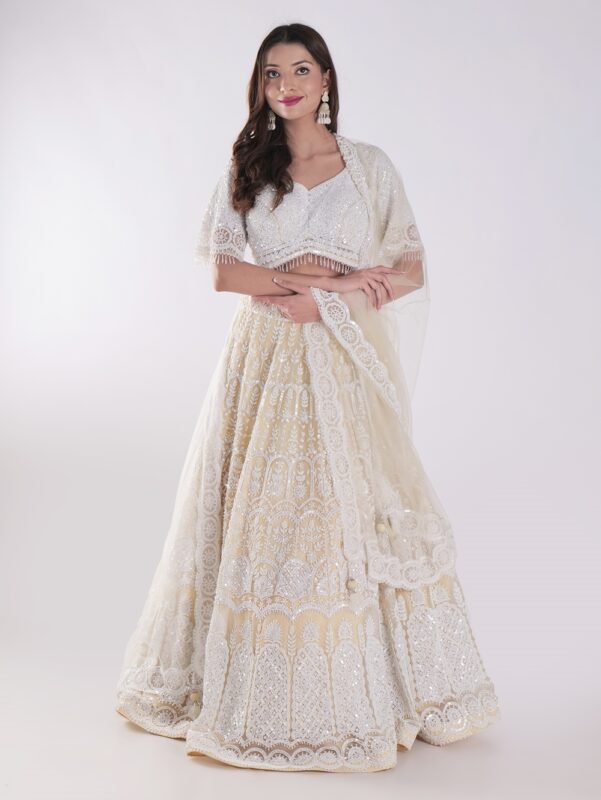 Net Embordered White and Cream Intricately Beaded Party Wear Luxury Lehenga Set