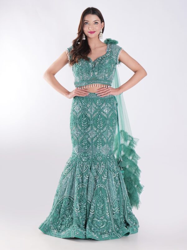 Teal Colored Cocktail Party Wear Fish Cut Style Lehenga Set