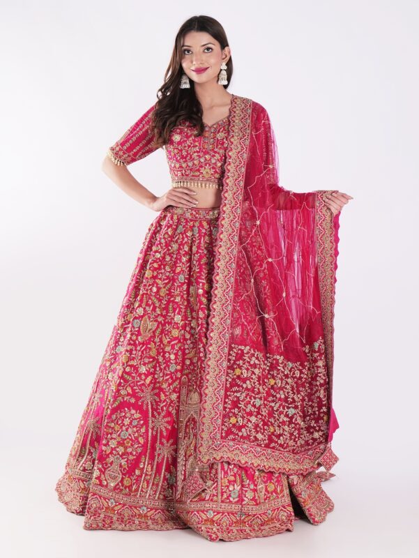 Delicate Floral Patterns And Shimmering Sequins With Hand Embroidery Red Bridal Lehenga Set