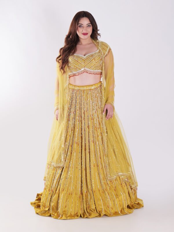 Stunning Mustard Yellow Backless Party Wear Lehenga Choli Set
