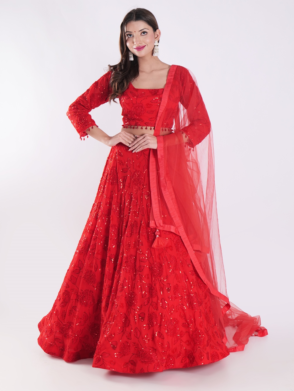 Backdrop, adorned in a vibrant red lehenga. The ensemble features intricate floral embroidery, meticulously crafted with shimmering sequins. The skirt of the lehenga is voluminous and flowing, creating a graceful silhouette. A matching red choli with long sleeves complements the skirt, while a sheer red dupatta adds a touch of elegance. The woman’s long, dark hair cascades down her shoulders, and she wears delicate earrings. Her confident posture and radiant smile radiate charm and beauty. The overall look is a stunning example of traditional Indian attire, perfect for a special occasion.