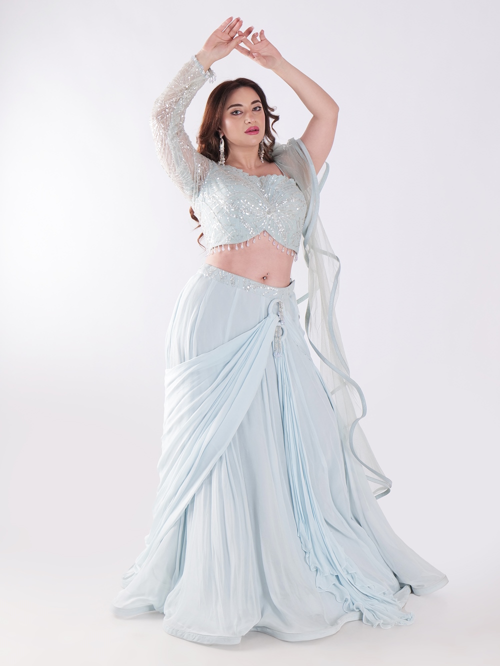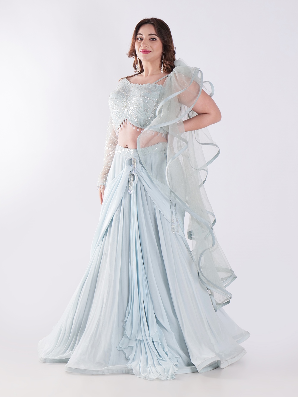 Beautiful Light Blue Flowing With A Delicate Embellished Bodice Indowestern Lehenga Choli Set