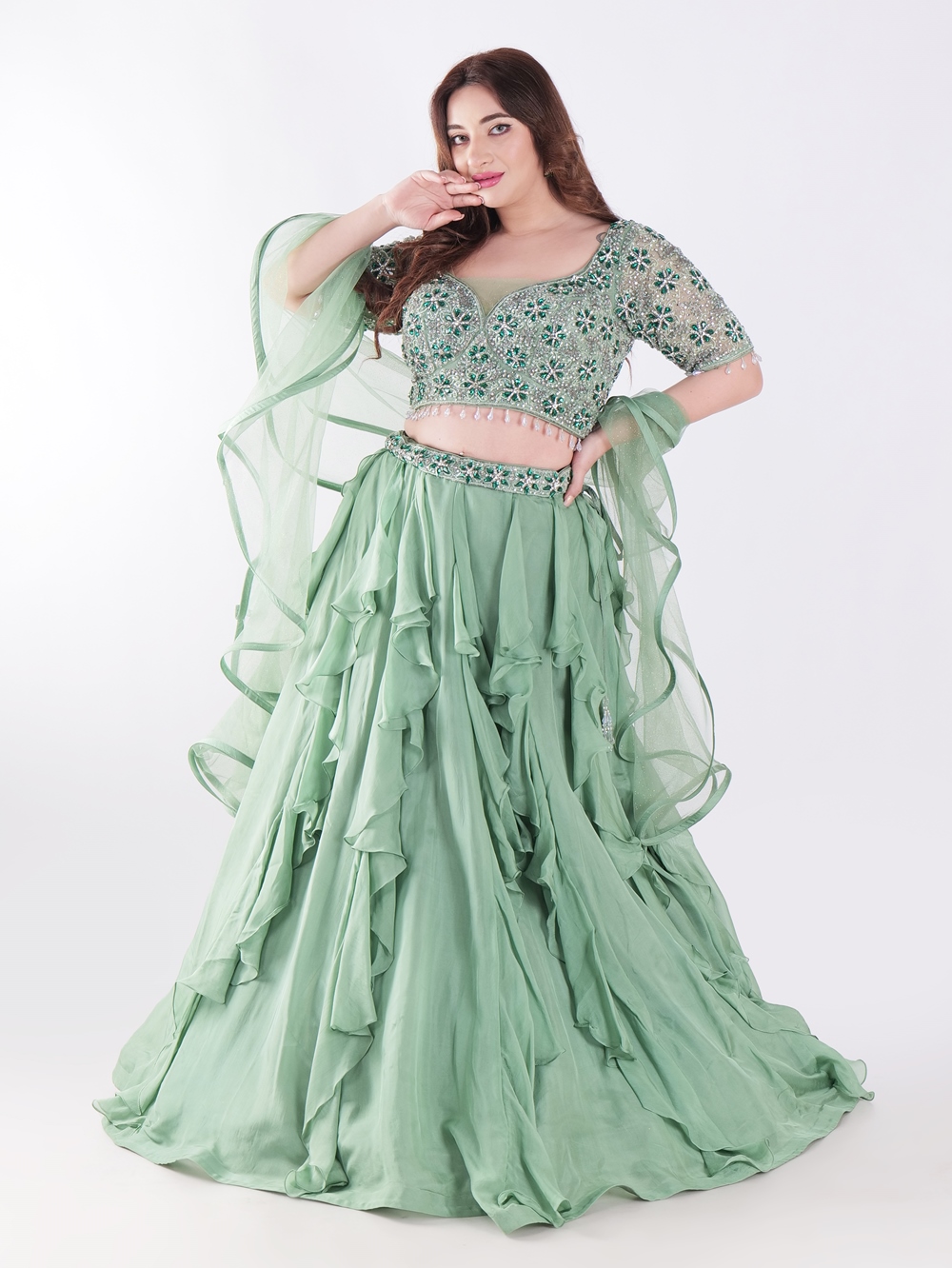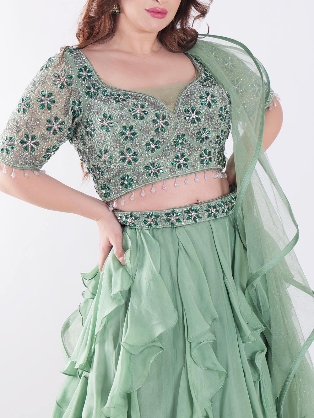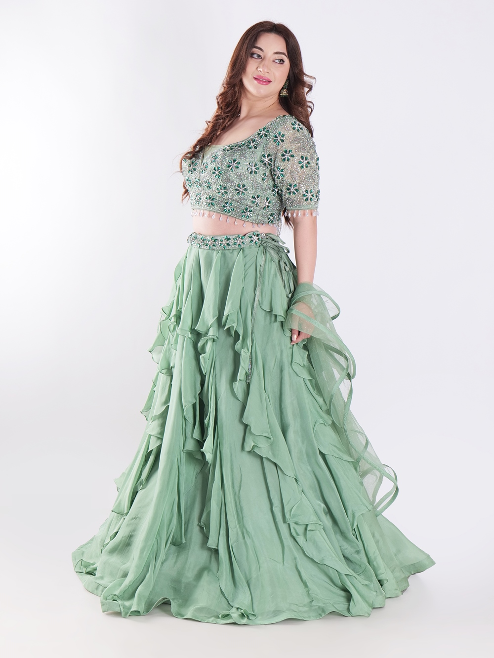 Sage Green With Intricate Silver And Emerald Green Embellishments Ruffled Lehenga Set