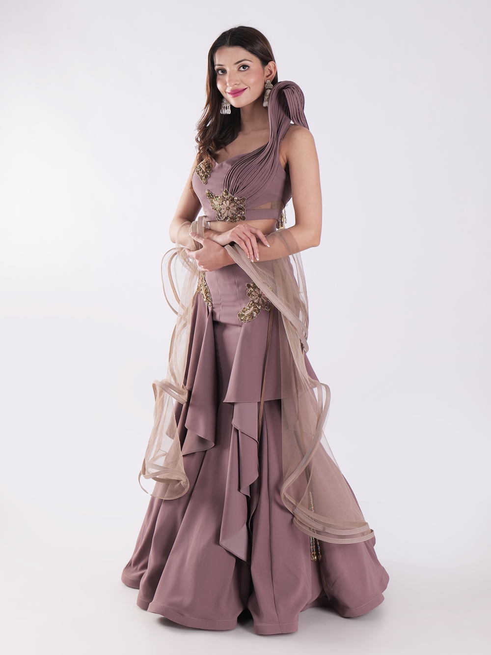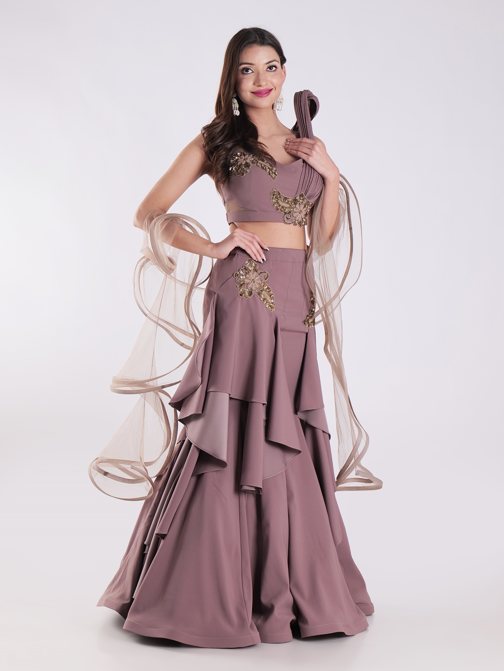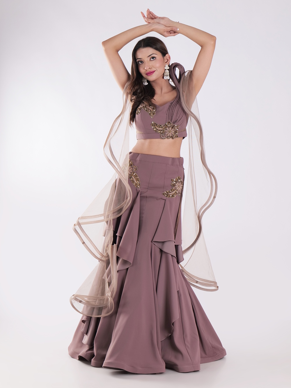 Adorned in a stunning mauve outfit. She wears a sleeveless crop top with intricate gold embroidery, paired with a flowy, layered skirt that features dramatic ruffles cascading down to her ankles. The skirt is further accented by a sheer, flowing dupatta, adding a touch of elegance and ethereal charm. Her long, dark hair cascades down her shoulders, and she accessorizes with delicate gold earrings. The model’s confident pose and captivating gaze enhance the overall allure of the outfit, making it a perfect choice for a special occasion or a night out.