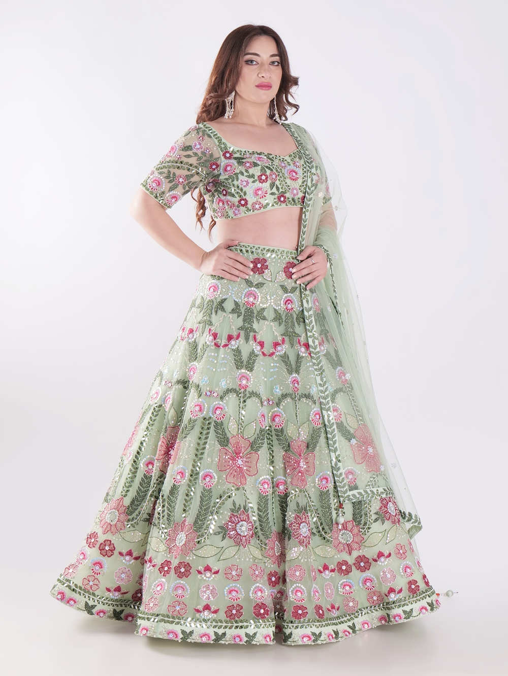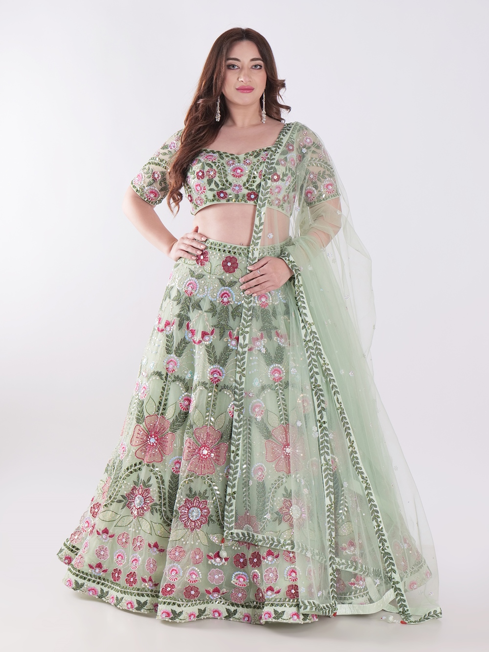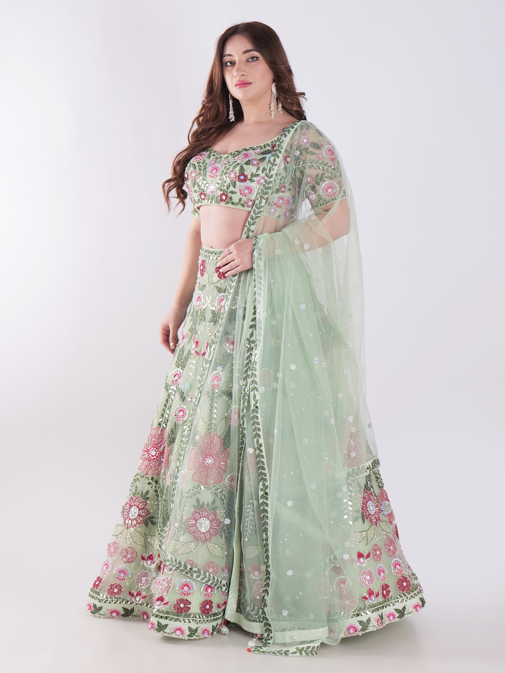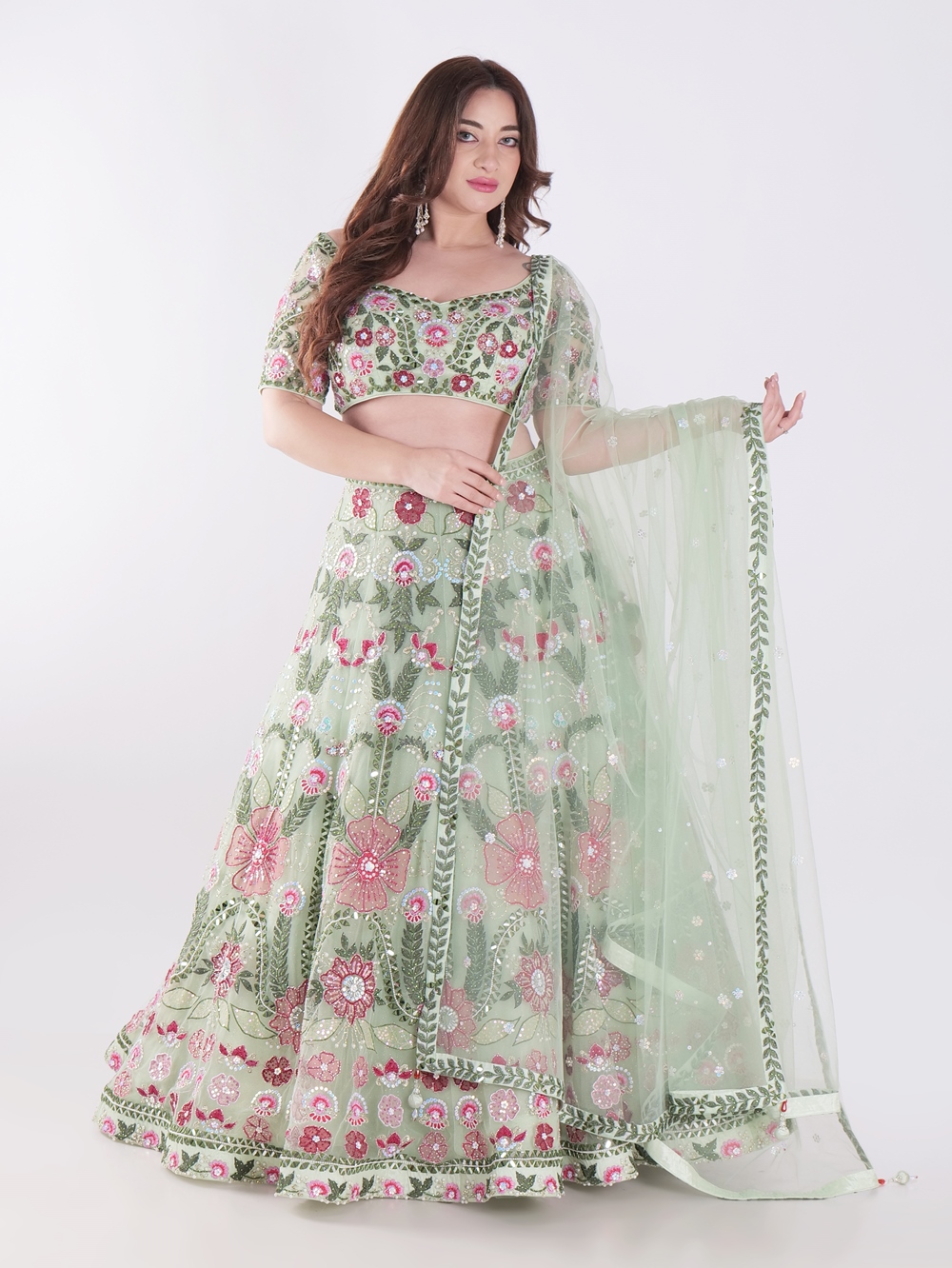 Adorned in a stunning green lehenga, a traditional South Asian outfit. The lehenga features intricate floral embroidery in shades of pink, creating a delicate and feminine design. The sheer fabric of the lehenga, adorned with sequins and beads, adds a touch of sparkle and grandeur. The woman’s back is visible, highlighting the intricate design of the blouse, which features a deep V-neckline and a delicate tie-up detail. The overall look is elegant and sophisticated, perfect for a special occasion or a festive celebration. The light background complements the vibrant colors of the outfit, enhancing its beauty and allowing it to be the focal point of the image. The woman’s long, dark hair cascades down her back, adding to the overall elegance of the look.