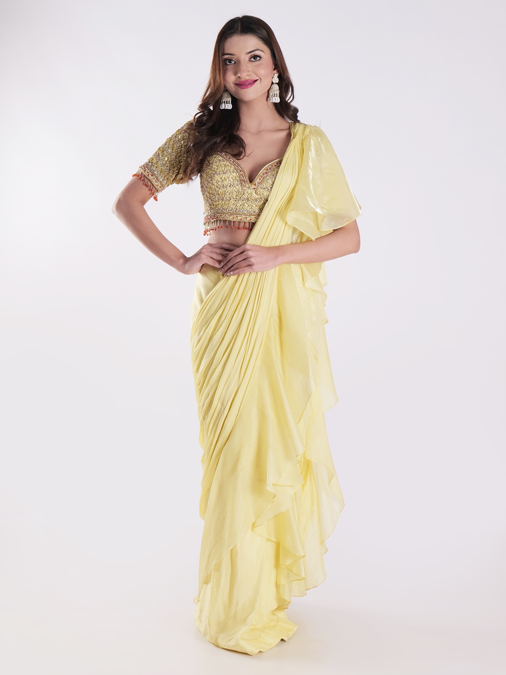 Vibrant Yellow Saree With A Ruffled Design And Golden Embellished Blouse With A Plunging Neckline